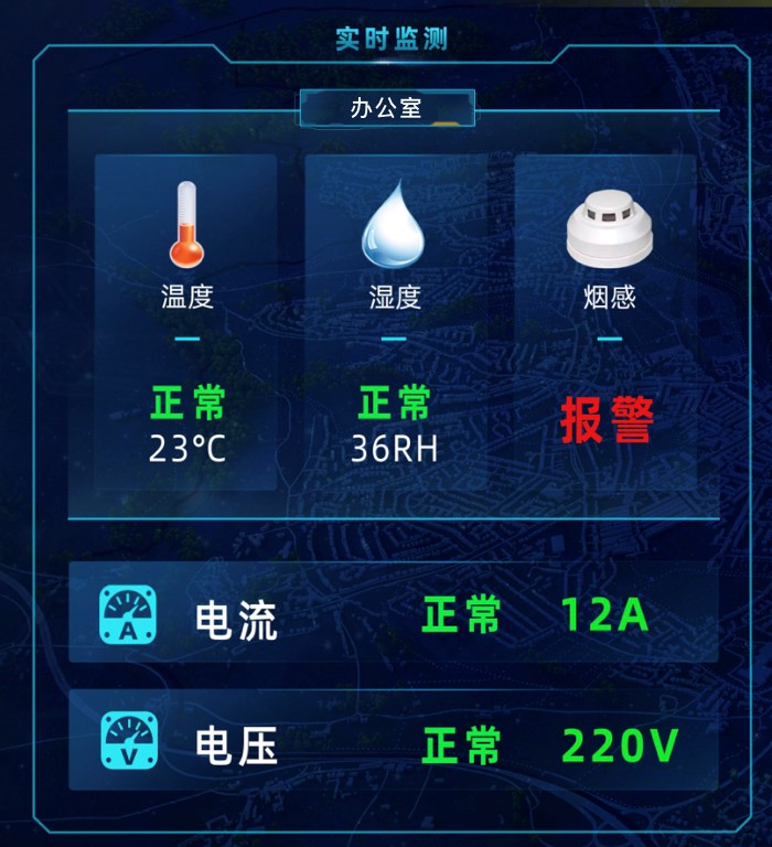 可根據(jù)的實際平面布局圖,添加成電子地圖,將各智能傳感、攝像機等設(shè)備點位標注在電子地圖上。即顯示所有傳感器主題及位置,正常是為綠色,告警時為紅色。