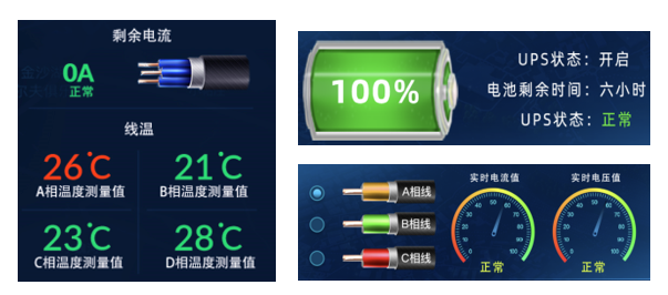 實時監(jiān)測用電設(shè)備、環(huán)境監(jiān)測設(shè)備的各項參數(shù)(電流、電壓、剩余電流、線溫、環(huán)境溫度、UPS等數(shù)據(jù))進行圖形化展現(xiàn)。